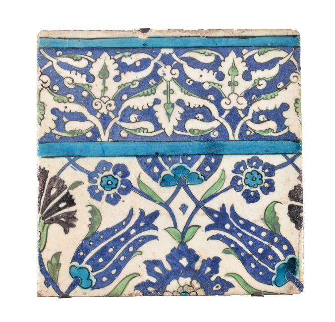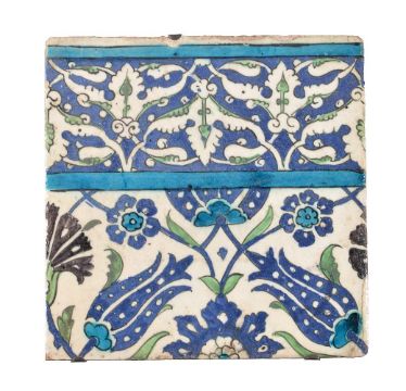 A Damascus glazed fritware tile, Ottoman Syria, late 16th century, painted with tulips and other floral motifs, split palmette border panel along the top, 26cm square, mounted for wall hanging Provenance: From the Estate of the late Sir Howard Hodgkin CH CBE, acquired Versailles auction room, 20th April 2011, part lot 44b.