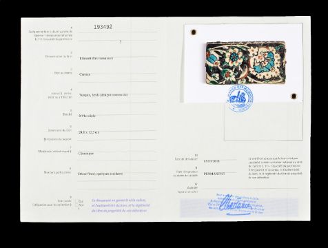 An Iznik glazed fritware border tile, Ottoman Turkey, circa 1600, of rectangular form, with scrolling floral design on black ground, the sloping tile edge also glazed with blue flower floral motifs, 13.5cm x 24.5cm, mounted for wall hanging Provenance: From the Estate of the late Sir Howard Hodgkin CH CBE, acquired Claude Aguttes, 18th May 2011, lot 72.