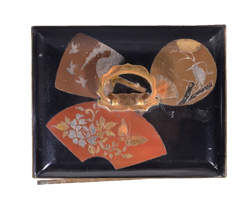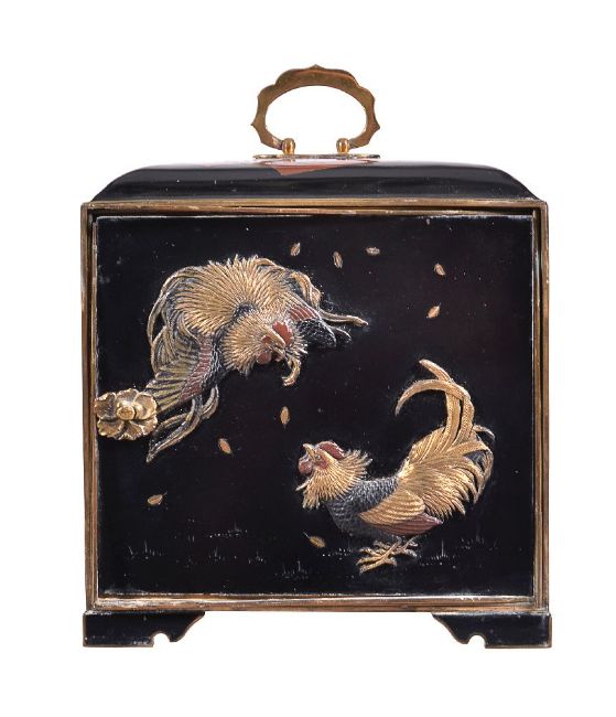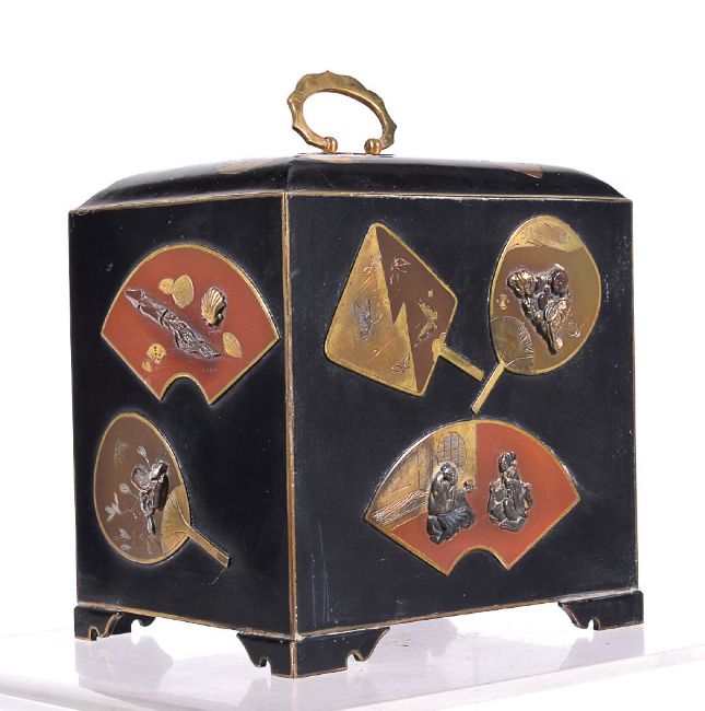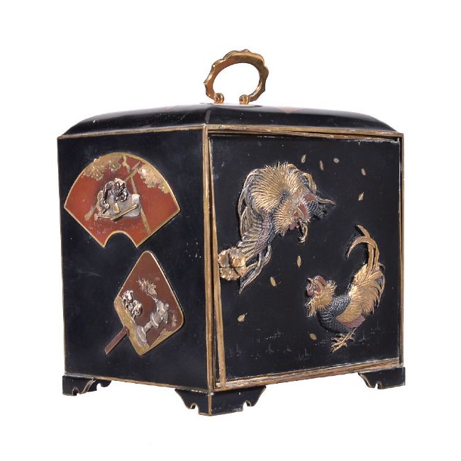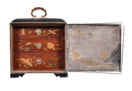 A Shakudo Kodansu, of rectilinear form containing three wood drawers decorated in gold lacquer to the fronts with Buddhist treasures, the door and sides being shakudo decorated in iro-e takazogan and honzogan with various figural, animal and genre subjects within fan shaped reserves, the top with a gilt metal handle, the whole resting on bracket feet, dimensions, 13.9cms by 10.9cms by 17.5cms, Meiji Period