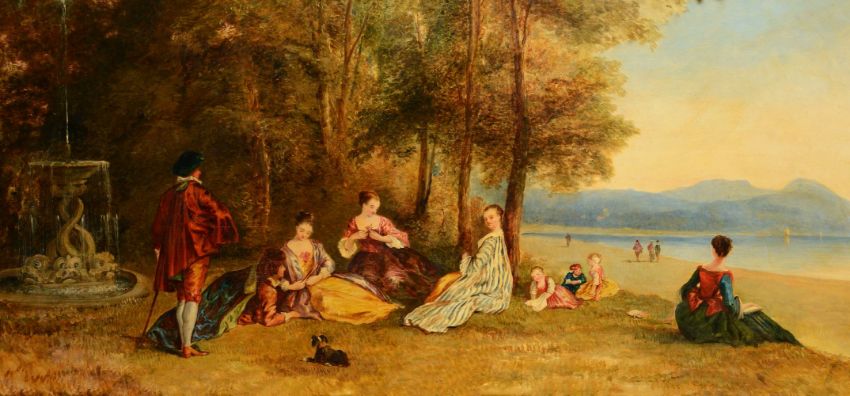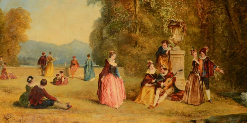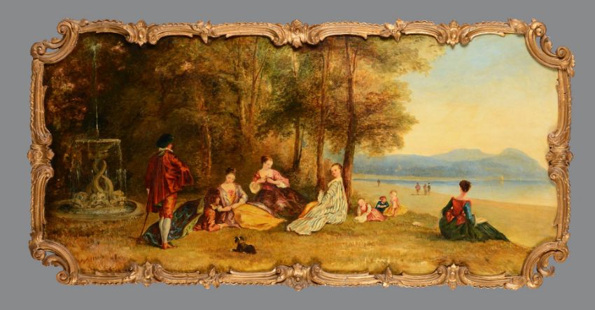 Manner of Jean-Antoine Watteau A pair of fête galante panels Oil on shaped rectangular panels Each 60 x 126cm (23½ x 49½ in.) (2)