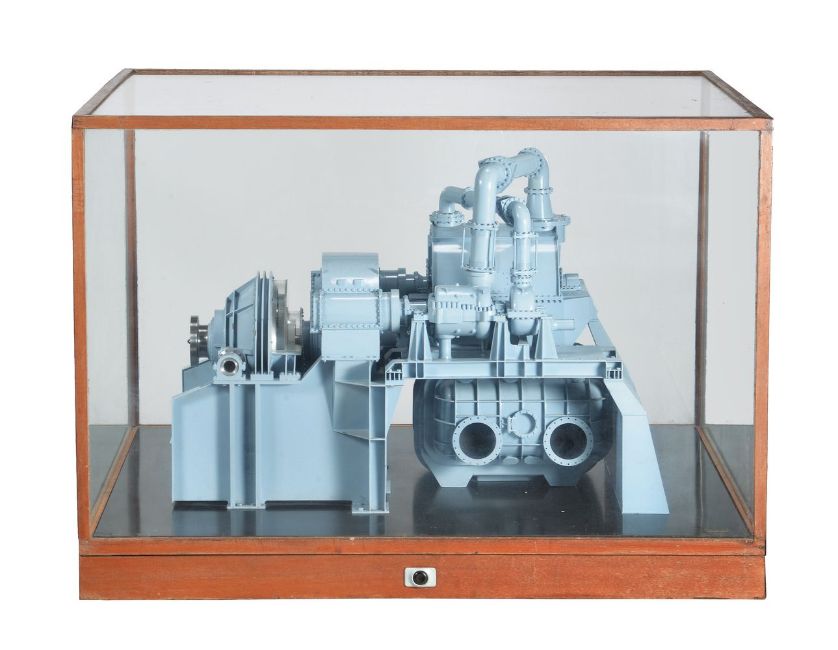 A fine quality boardroom model of a steam turbine engine, by H Clarkson of York built as a private commission to a scale of 1 inch to one foot, electrically motorized, on a plinth base with applied builder's plaque, in a glazed case. Model overall height 72cm. Base 112cm x 88cm.* Provenance: Purchased Dreweatts Bristol. Lot 18. 6th of September 2011. Please note the estimate for this lot has been revised after the catalogue was printed.