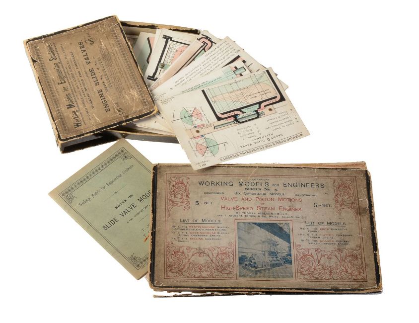 Boxed collections of engineer's cardboard models of articulated steam valves for use with steam engines. They include the “Erith” compound engine, Westinghouse single acting Compound engine, Westinghouse double cylinder engine, “Bellis” Compound engine, “Willans” Central-Valve Compound engine, “Clayton” Compound Tandem Engine. And a box containing eight cardboard articulated slide valve illustrations by T.Jones and T.G.Jones Manchester.