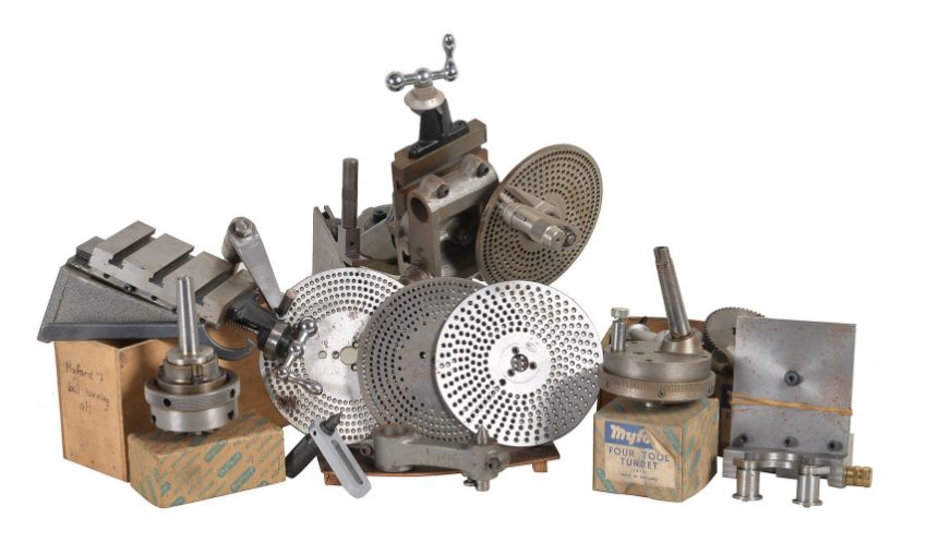 A collection of Myford lathe parts, vertical slide, two chucks and a vertical swivel slide with dividing head and four plates.