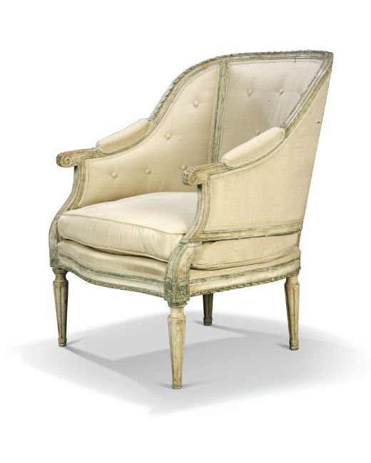 A Louis XVI Grey-Painted Bergere, 18th century, with arched moulded frame, carved top rail and padded arms, and shaped seat on tapering fluted legs headed by paterae, signed SENE Provenance: Mallett, 1981