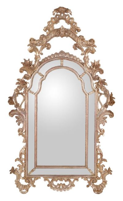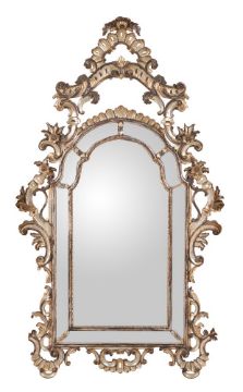 A pair of Italian carved and silvered wall mirrors, in the rococo style, 20th century, with elaborate pierced and foliate carved frames, the arched plates with panelled margin borders, 181cm high, 106cm wide