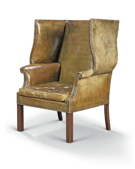 A George III mahogany and nailed leather upholstered wing armchair, late 18th century, on square legs, 114cm high Provenance: Sotheby's, 22 May 1981, lot 151.