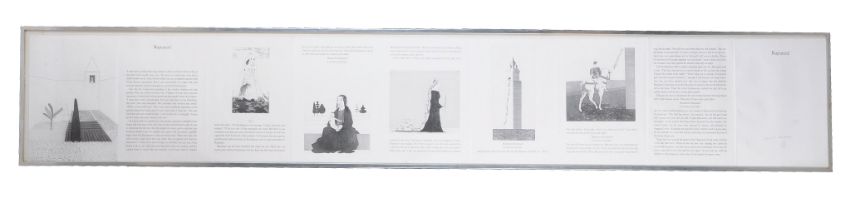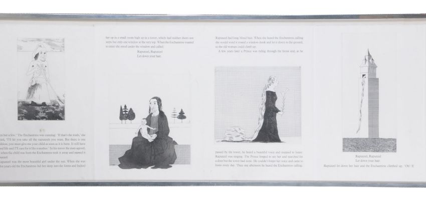 David Hockney (British b. 1937) Rapunzel (Scottish Arts Council 81-86) Six etchings and text, 1969, from 'Illustrations for Six Fairy Tales from the Brothers Grimm', framed as one Signed in pencil and numbered 57/100 on the title page Overall: 45 x 280cm (17½ x 110 in.)