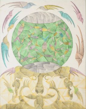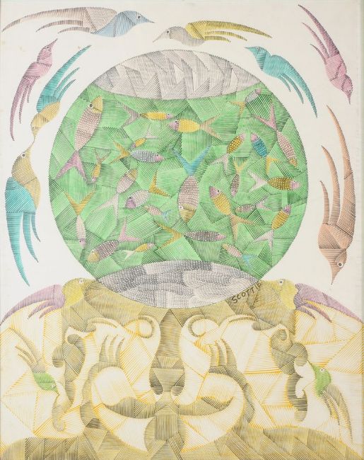 Scottie Wilson (Scottish 1888-1972) Fish & Bird World Watercolour and ink Signed to the centre 60.5 x 47.5cm (23¾ x 18½ in.) Provenance: Editions Graphiques, London Ivan Florence Esq. (purchased from the above in November 1968) Exhibited: London, Editions Graphiques