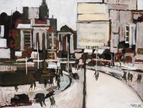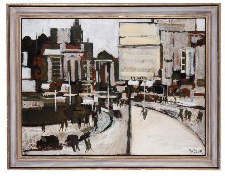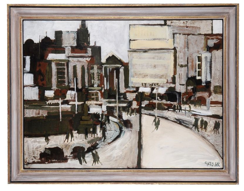 Geoffrey Key (British b. 1941) Piccadilly, Manchester Oil on board Signed and dated 65 lower right 91 x 122cm (35¾ x 48 in.) Provenance: Sale, Christie's South Kensington, 22 March 2012, lot 112