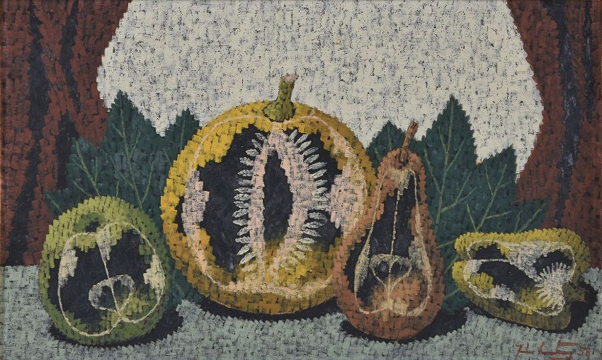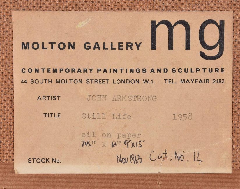 John Armstrong (British 1893-1973) Still life Oil on board Signed and dated 58 lower right 24 x 39cm (9¼ x 15¼ in.) Provenance: Annette Armstrong Acquired from the above by the present owner Exhibited: London, Molton & Lords Galleries, November 1963, cat no. 14 Literature: Andrew Lambirth, John Armstrong, The Paintings, London, 2009, p. 216, no. 618