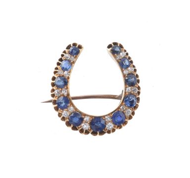 A late Victorian sapphire and diamond horseshoe brooch, circa 1890, set with alternating circular cut sapphires and old cut diamonds, approximately 0.60 carats total, 2.8cm wide, 10g gross