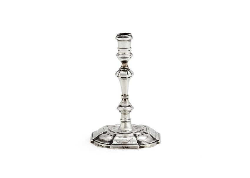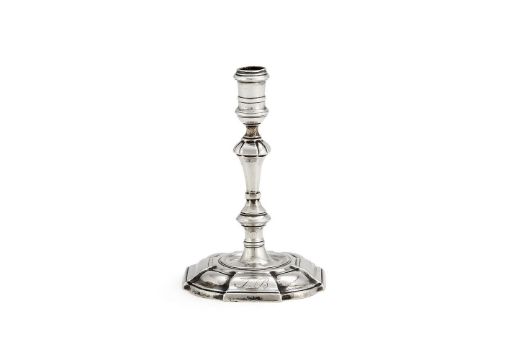A George II cast silver taperstick by James Gould, London 1738, with a reel capital, a tapered and knopped stem, on a shaped square base, engraved JB, 10.5cm (4 1/4in) high, 125g (4 oz)