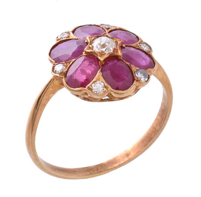 A ruby and diamond cluster ring, the central old cut diamond within a surround of oval cut rubies and eight cut diamonds, finger size N 1/2, 3g gross