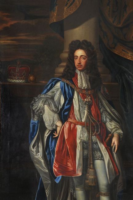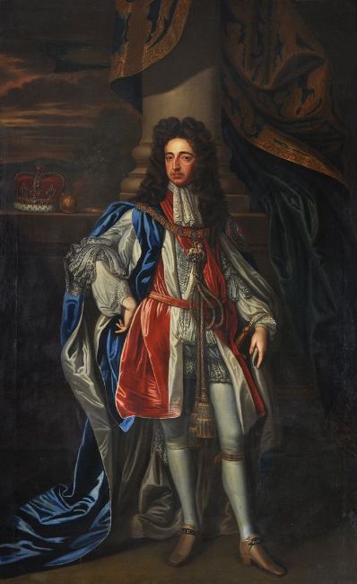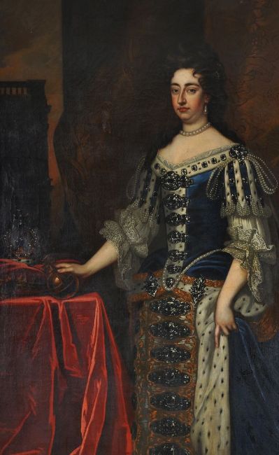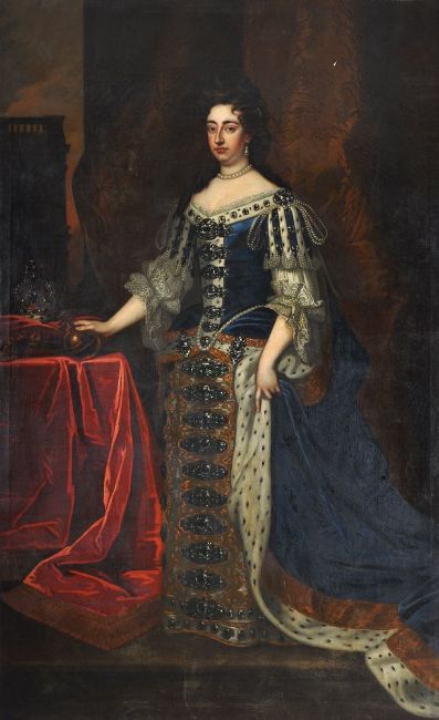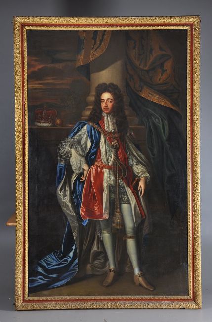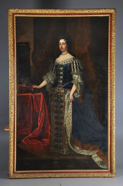 Follower of Sir Godfrey Kneller Portraits of William and Mary in coronation robes Oil on canvas, a pair Each 239 x 146cm (94 x 57¼ in.) (2) Provenance: Sale, Phillips, Hampton Court, June 1972, Lot 548 Kirtlington Park, Oxfordshire The portrait of Mary II is after the portrait by Sir Godffrey Kneller painted in 1690, and now in the Royal Collection, Windsor Castle, Ref: RCIN 405674