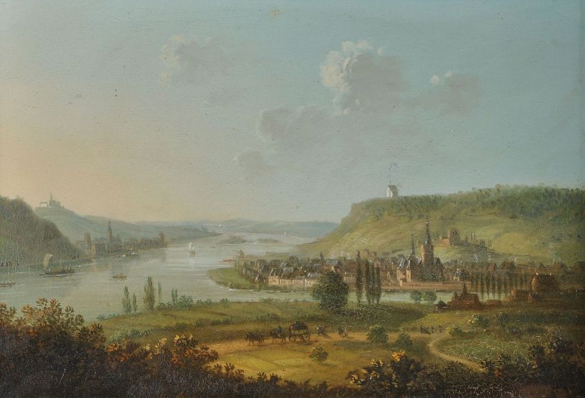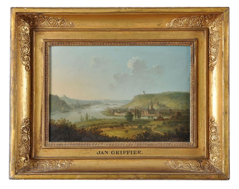 Manner of Jan Griffier the Younger A Rheinish landscape with a river running through a town, and a horse and cart in the foreground Oil on metal 17 x 26cm (6½ x 10 in.)