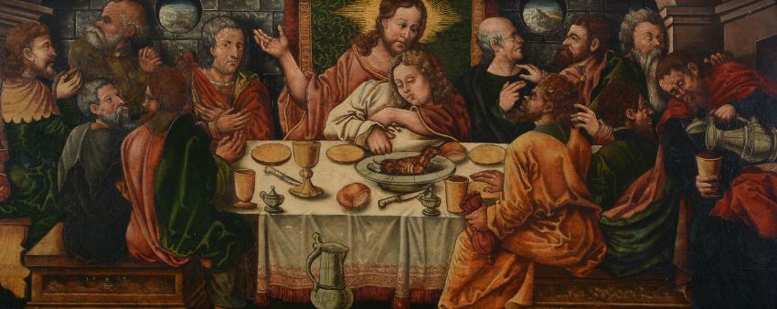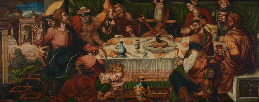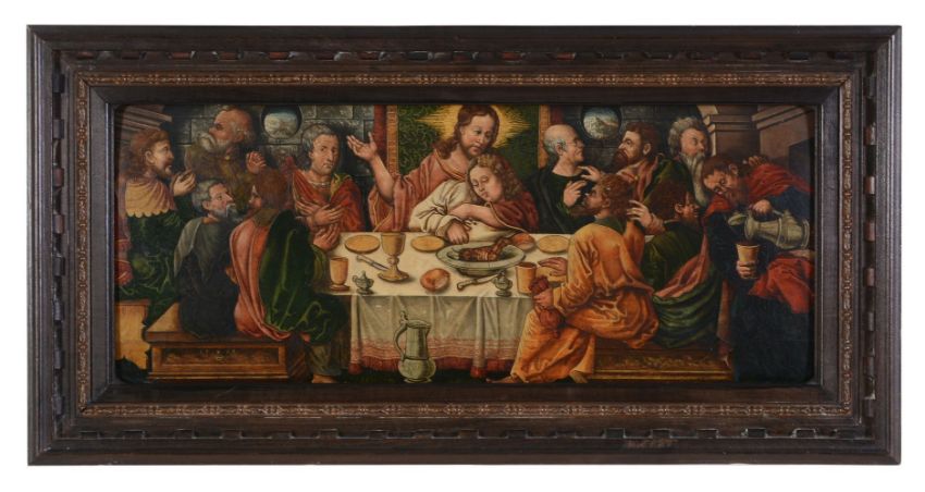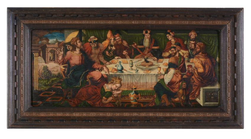 Follower of Maerten Jacobsz van Heemskerck The Last Supper; The Magdalene washing Christ's feet Oil on panel Both bearing monogram EH and dated1565 lower left and lower right respectively Each 24 x 60cm (9¼ x 23½ in.) (2)
