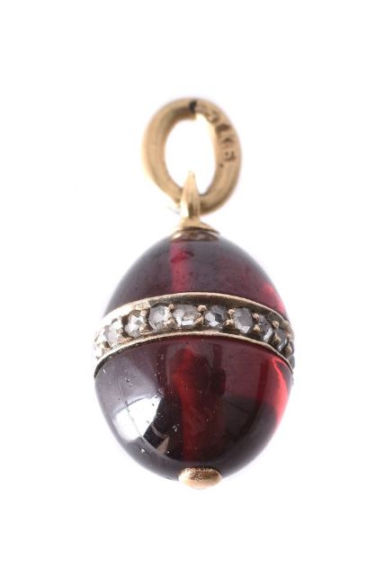 A late 19th century Russian garnet and diamond egg pendant by Karl Bok, the polished garnet egg set with a band of rose cut diamonds, signed КБ for Karl Bok, with 56 zolotnik mark and assay mark for St Petersburg pre 1899, 1.9cm long including bale
