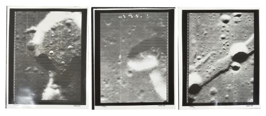 A group of seven vintage NASA gelatin silver prints, various frames, medium and high resolution images of the Moon's various locations. Lot includes: