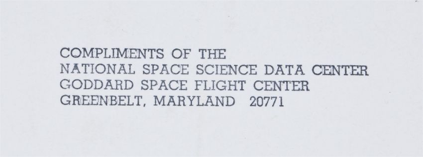 Stamped COMPLIMENTS OF THE NATIONAL SPACE SCIENCE DATA CENTER GODDAD SPACE FLIGHT CENTER GREENBELT, MARYLAND 20771