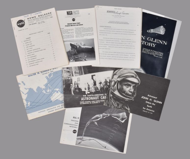 A collection of vintage publications and press kits related to the NASA's Mercury programme, comprising:
