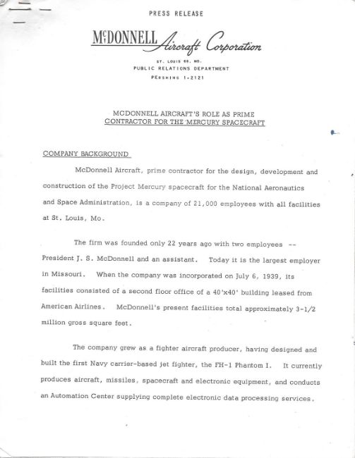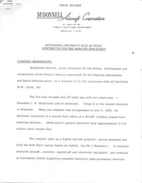 - McDonnell Aircraft's Role as Prime Contractor for the Mercury Spacecraft, McDonnel Aircraft Corporation press release, no date, 22 pages, a correction in hand on page 2.