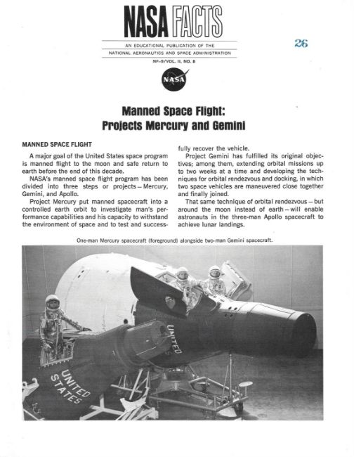- Manned Space Flight: Projects Mercury and Gemini, Nasa Facts NF-9/Vol. II, no. 8, 12 pages.