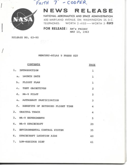 - Mercury -Atlas 9 Press Kit, NASA New Release, No. 66-90, AM's Friday May 10, 1963. 69 pages, staple bound, hand annotated on the cover 'Faith 7 - Cooper'.