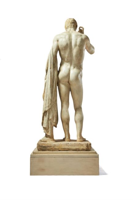 An impressive life-size plaster model of Germanicus, or Marcus Claudius Marcellus as Hermes Logios, after the Antique, probably early 19th century, modelled nude and standing contrapposto, the right arm raised, and the left supporting a drape, on an integral rectangular socle, approximately 195cm high, the base 73 x 52cm The present plaster is modelled on the marble statue thought to represent Marcellus the Younger (circa 42 -23BC), nephew of Emperor Augustus and a prominent member of the Julio-Claudian dynasty that ruled Rome from 27BC until 68AD. The marble original was unearthed during the 17th century, resided at one point in the collection of King Louis XIV, and is now in the collection of the Louvre. It is thought to have been sculpted several years after Marcellus' death, and presents him as an idealised youth and in the guise of 'Hermes Logios', the god of eloquence, perhaps alluding to the subject's oratory skills and statesmanship. The sculpture is also often referred to as Germanicus, a Roman general and member of the Claudian dynasty.Plaster casts after Antique monuments really rose in popularity during the 18th and 19th centuries, occupying prominent positions in Neoclassical interiors and serving as valuable teaching aids at art academies across Europe. The art collection of the University of Edinburgh for example still holds a cast after the statue that was acquired during the late 19th or 20th century, though the closest comparable example is the model in the Museum of the Academy of Fine Arts, Krakow. This incredibly similar example is known to have been acquired by the Academy in Vienna in 1826, firmly establishing the date of manufacture of that model in the earlier part of the 19th century. A cast of the same subject is also known to have been presented to the Royal Academy by the Prince Regent in 1816, and it is possible that this lot dates from a similar period. Further reading: Haskell and Penny, Taste and the Antique, Yale University Press, 1981, pp. 219-20, no. 42Condition Report: The lot bears the usual minor marks, knocks and scuffs overall consistent with age and use.There are some losses to the painted surface, particularly to the upper back.There are also chips and losses to the plaster, especially the rectangular base (front and rear left corner, left and right sides) and to the exposed edges of the suspended drapery. There are casting joins visible in places, a result of manufacture. Possible restoration to lower portion of the tree trunk, possibly the lower portion of the hand, raised right wrist, and sections of paint may have been refreshed. It is possible that the plaster is more broadly 19th century in make.Minor losses to paint on plinth.Condition Report Disclaimer