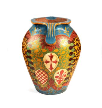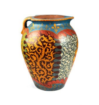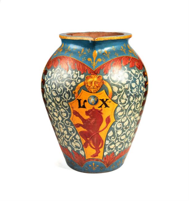 A substantial Italian polychrome painted terracotta vessel or jardiniere, late 19th century, of inverted baluster form, the rim with pouring lip above a shouldered body painted with heraldic motifs, arabesques, fleurs-de-lys, and a shield emblazened with L.X 67cm high, 46cm wideCondition Report: Generally ok but with some paint loss to top of rim and some areas of discolouration to paint and with marks to paint and minor paint losses Condition Report Disclaimer
