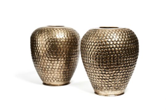 A pair of Indian silvered brass repoussé vases, mid-20th century, each of bulbous form, with bubbled effect, 33cm high, 28cm wide