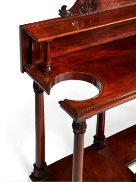 A William IV mahogany hall stand or console table, circa 1835, in the manner of Gillows, the shelved superstructure above the table top with apertures to each short side for sticks, the top above a blind frieze drawer and turned and lappet carved columnar supports and shaped platform base incorporating the drip pans, 116cm high, 173cm wide, 50cm deepCondition Report: Marks, knocks, scratches, abrasions consistent with age and use,Overall with a polished appearance, the middle of the top with some old marks and wear - it appears something like a vase or a sculpture has stood here previously,Overall sold and stable The drip pans with the usual marks and corrosion expected with items of that sort, would perhaps benefit from re-blackingCondition Report Disclaimer