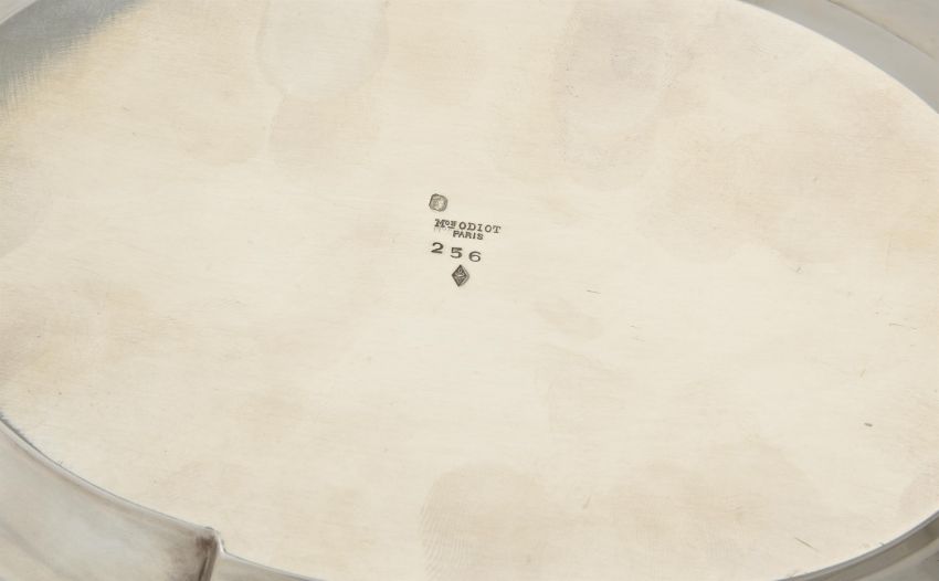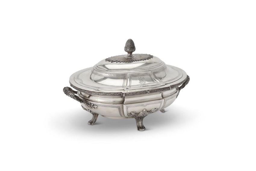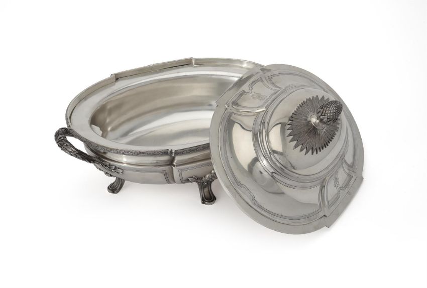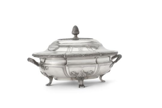 A French silver shaped oval soup tureen and cover by Maison Odiot (1906-1956), Paris 1838-1972 1st standard, with a pine cone finial to the dome centred and panelled cover engraved with monograms, the base with a ribbon tied leaf rim, complementary twin loop handles, complementary panels, on four laurel and foliate panelled feet, with an electro-plated liner, 35cm (13 3/4in) across handles, 2350g (75.55 oz) weighable