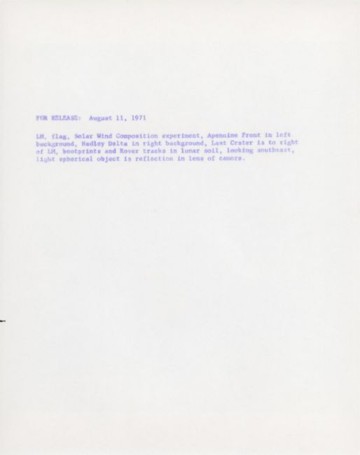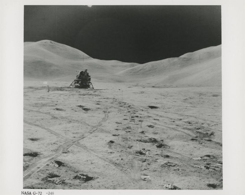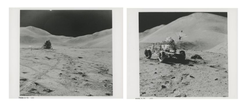 James IrwinTwo photographs illustrating the spectacular mountainous moonscape of Hadley-Apennine.1) Hadley Base at the foot of the Apennine mountain range 2) David Scott and the Lunar Rover in front of Mount Hadley Delta and Hadley Canyon at station 9A 2 August 1971 EVA 3Two vintage gelatin silver prints on fibre-based paper, each 25.4 x 20.3 cm (10 x 8 in), BLACK NUMBERED NASA G-72-248 and NASA G-72-930 [AS15-82-11057 and AS15-82-11121], with NASA captions on the verso (NASA Manned Spacecraft Center)Footnotes:Two photographs illustrating the spectacular mountainous moonscape of Hadley-Apennine.The Swann Range (an area of the Apennine mountains between Mount Hadley and Mount Hadley Delta) forms the background of the first photograph taken at the beginning of the third EVA toward the LM from the ALSEP site. In the centre of the image the American flag is illuminated by the sun. Wheel and foot tracks crisscross in the foreground.The second photograph was taken after the drive to station 9A, located at the edge of Hadley Rille, about 1.8 kilometres west of the LM. Scott is collecting a camera from the Rover to photograph the far side of the Rille which is about 1 km across. Behind the Rover to the right is Mount Hadley Delta with the huge St George Crater punched into its side.'They [the mountains] looked big, but not as big as they were. Interestingly enough. And they were enormous. They were huge. But I expected them, frankly, to look bigger in the scope of things. The problem is, you don't have anything to compare them with, 'cause how high is up, and how big is big?' David Scott