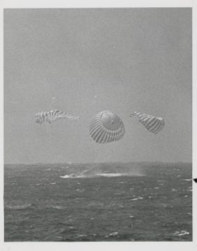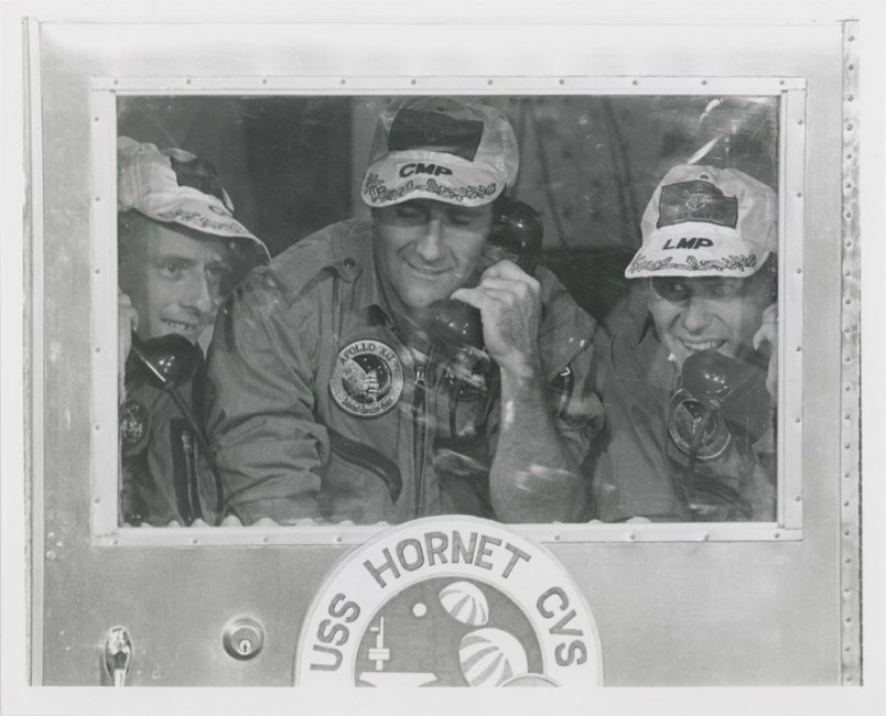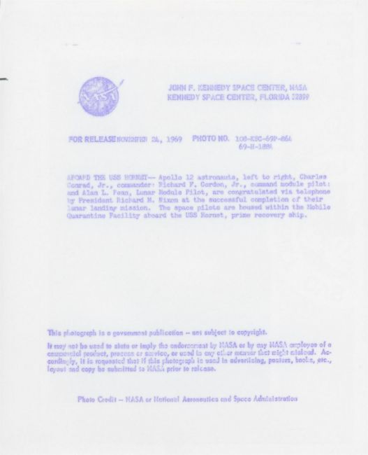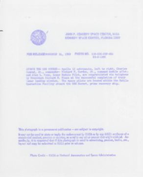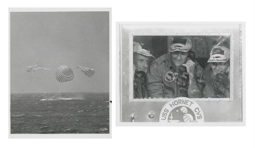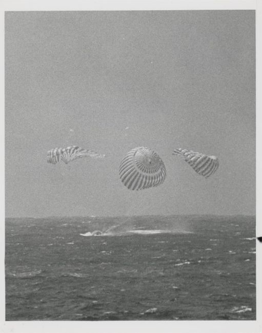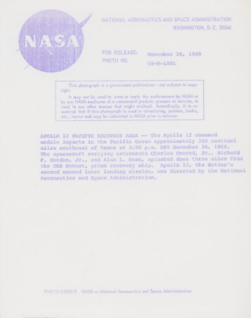 NASAA pair of photographs1) A view of the Apollo 12 splashdown24 November 1969Vintage gelatin silver print on fibre-based paper, 20.3 x 25.4 cm (8 x 10 in), NASA photo no 69-H-1881, with a NASA HQ caption on the verso2) The crew receive congratulations from President Richard Nixon while they quarantine24 November 1969Vintage gelatin silver print on fibre-based paper, 20.3 x 25.4 cm (8 x 10 in), NASA photo no 69-H-1884, with a NASA HQ caption on the verso