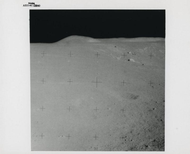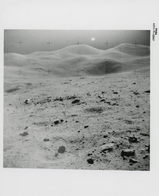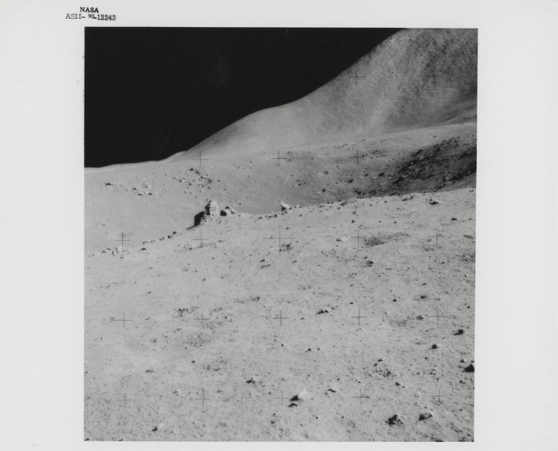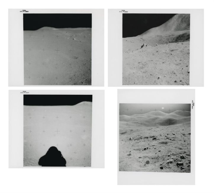 James IrwinFour moonscapes at Dune Crater, station 41 August 1971Four vintage gelatin silver prints on fibre-based paper, each 25.4 x 20.3 cm (10 x 8 in), BLACK NUMBERED NASA AS15-90-12237, AS15-90-12240, AS15-90-12243 and AS15-90-12247 in top margins, (NASA Manned Spacecraft Center)Footnotes:The site of Hadley-Apennine offered to the astronauts the most beautiful scenery of the Apollo missions.These rare photographs were captured during a quick stop near the 500m wide Dune Crater on the return traverse back to the LM from station 7 and feature Irwin's shadow and Hill 305; the rim of Dune Crater and Hill 305; Dune Crater and Mount Hadley; the rim of Dune Crater and the Swann Range. 'Oh, the beauty! The spectacular beauty,' exclaimed Scott. 'Oh, yeah, that is, to coin a phrase mind-boggling. It's absolutely mind-boggling, because you cannot believe that it is really that spectacular. I didn't expect the beauty of it. That's the one thing everybody talks about, and you can't appreciate it until you get there and see it'.Condition Report: 1) NASA AS15-90-12237: very good2) AS15-90-12240: light corner crease in upper left, a small dent and a mark, otherwise good3) AS15-90-12243: three creases/dents in upper left, a bend along the upper margin, some abrasion to the surface and a finger print in the upper portion of the photograph, 4) AS15-90-12247: two light dents, one in upper left corner and one in lower margin, otherwise very good Condition Report Disclaimer