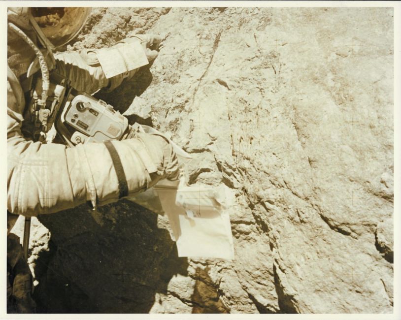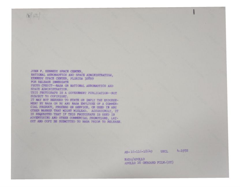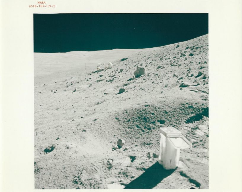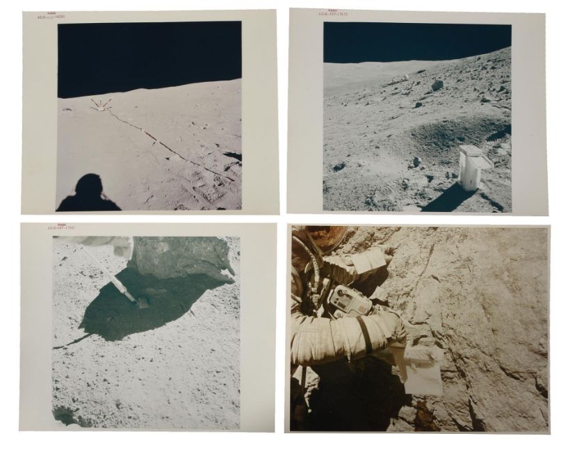 1) Charles DukeA photograph from a panoramic sequence featuring the magnetometer21 April 1972 (1st EVA)Vintage chromogenic print on fibre-based paper, 25.3 x 20.5 cm (10 x 8 in), RED NUMBERED AS16-113-18350, with A KODAK PAPER watermark on verso2) John YoungLunar Roving Vehicle parked in a lunar depression on a slope of Stone Mountain, a sample collection bag in the foreground 22 April 1972 (2nd EVA) Vintage chromogenic print on fibre-based paper, 25.3 x 20.5 cm (10 x 8 in), RED NUMBERED AS16-107-17473, with A KODAK PAPER watermark on verso3) John YoungCharles Duke scoops up lunar soil at the base of a small boulder at Station No. 9 22 April 1972 (2nd EVA) Vintage chromogenic print on fibre-based paper, 25.3 x 20.5 cm (10 x 8 in), RED NUMBERED AS16-107-17561, with A KODAK PAPER watermark on verso4) John Young Charles Duke examines closely the surface of a boulder at North Ray23 April 1972 (3rd EVA)Vintage chromogenic print on resin coated paper, 25.3 x 20.5 cm (10 x 8 in), photo no AS16-116-18649, with A KODAK PAPER watermark and NASA KSC caption on versoCondition Report: Very goodCondition Report Disclaimer