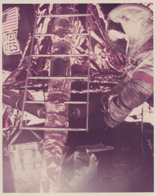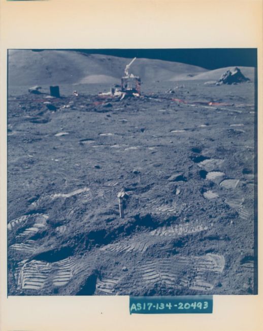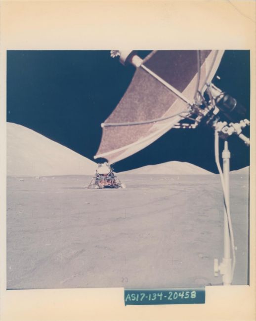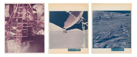 Eugene Cernan and Harrison SchmittThree lunar scenes at the end of the last EVA on the surface of another world, comprising:1) Eugene Cernan unveiling a commemorative plaqueVintage chromogenic print on resin-coated Kodak paper, 20.3 x 25.4 cm (8 x 10 in), [NASA photo no AS17-134-20481], with A KODAK PAPER watermarks on the verso2) Lunar Module during the final traverse of the Lunar Rover from Station 9 3) Experiments at the ALSEP site14 December 1972Set of two vintage chromogenic prints on resin-coated GAF paper, 25.4 x 20.3 cm (10 x 8 in), numbers NASA AS17-134-20458 and NASA AS17-134-20493 printed in bottom margin, with GAF watermarks on the verso (NASA / USGS)Footnotes:The third excursion of Apollo 17 marked the last human footsteps on another world in the twentieth century. During the record 22 hours spent outside on the lunar surface, Gene Cernan and Harrison Schmitt drove the Lunar Rover 22.5 miles around the Taurus-Littrow area of the Sea of Serenity.