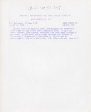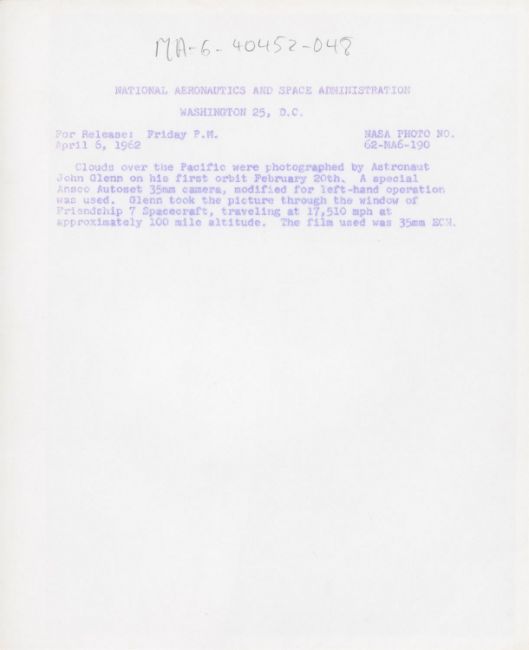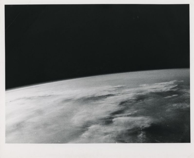 John GlennThe first human-taken photograph from space, a view of Earth's horizon over the Pacific Ocean20 February 1962Vintage gelatin silver print on fibre-based paper, 25.4 x 20.3 cm (10 x 8 in), NASA photo no 62-MA6-190, with NASA Headquarters caption on the versoCondition Report: Two cracks in top left and bottom right corner, two handling dents, slight abrasion to the gloss, otherwise fine. Additional images available on requestCondition Report Disclaimer