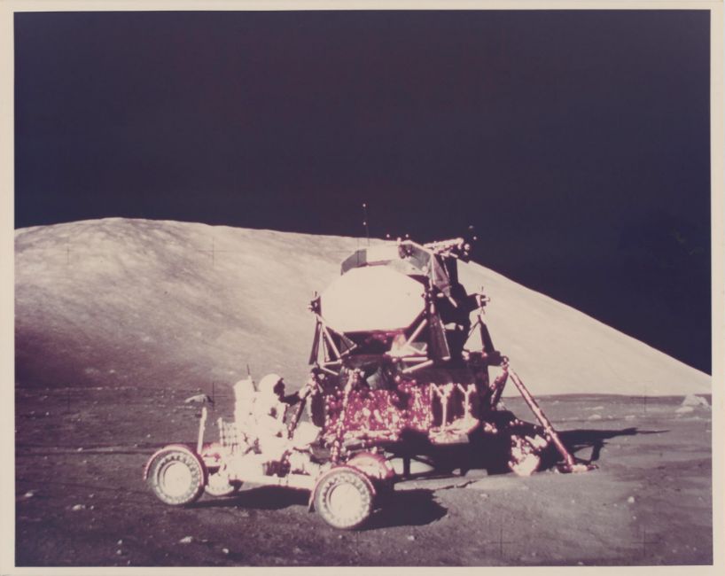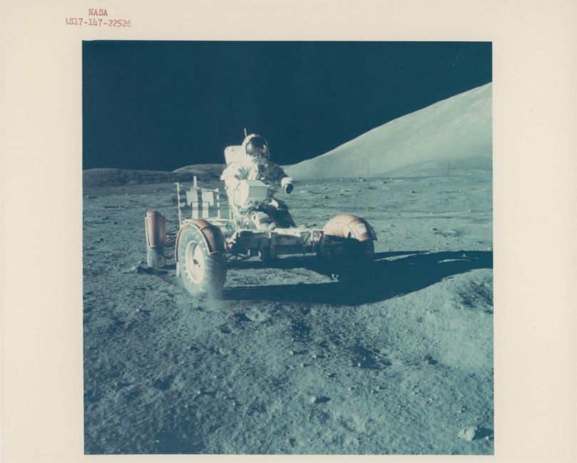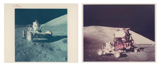 Harrison SchmittA pair of images, comprising:1) Eugene Cernan testing the unloaded Lunar Rover at Taurus-Littrow landing site, EVA 1 12 December 1972Vintage chromogenic print on fibre-based Kodak paper, 25.4 x 20.3 cm (10 x 8 in), RED NUMBERED NASA AS17-147-22526, with A KODAK PAPER watermarks on the verso, (NASA Manned Spacecraft Center)2) The Lunar Rover parked by the Lunar Module "Challenger", EVA 112 December 1972Vintage chromogenic print on resin-coated Kodak paper, 25.4 x 20.3 cm (10 x 8 in), [NASA AS17-147-22527], with A KODAK PAPER watermarks on the versoFootnotes:The crew had just extracted and activated the Lunar Rover and Eugene Cernan can be seen giving it a test drive. This was successful to the relief of the crew, as it was planned that Apollo 17 would be making longer traverses than any of the previous Apollo missions. The Rover was then loaded with tools, experiment hardware, a TV camera, and antennas. Condition Report: 1) Very good with one small mark to the image, two tape marks on the verso2) Front good, with one mark across the dark area of the image (approx. 3 x 3 cm) and minor spots to the edges; a small annotation in biro on the verso and light signs of age toningAdditional images available on requestCondition Report Disclaimer