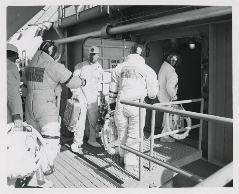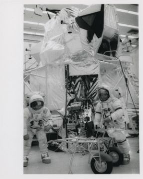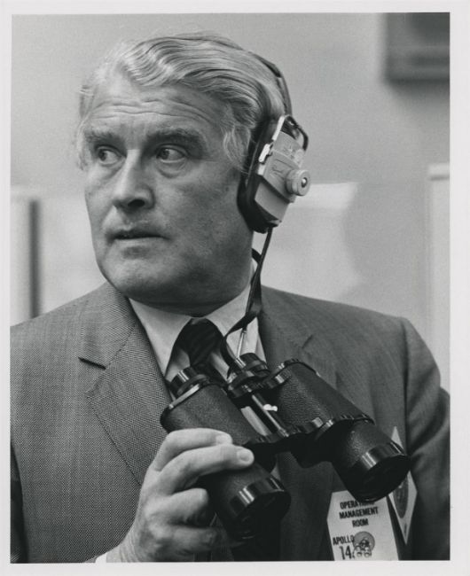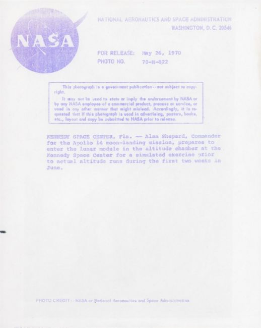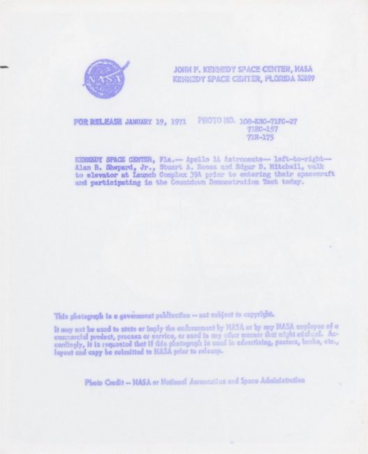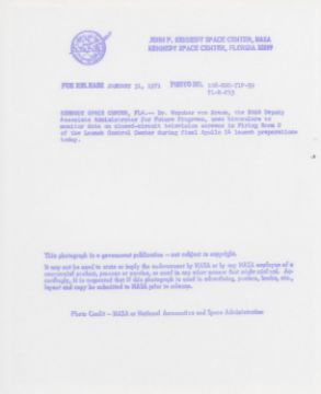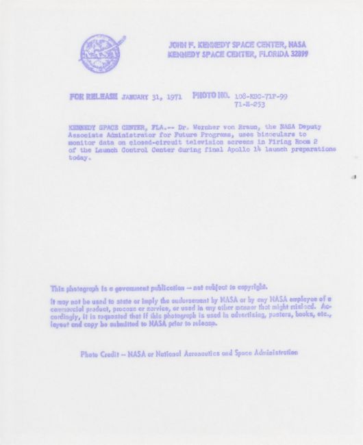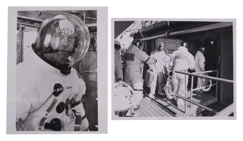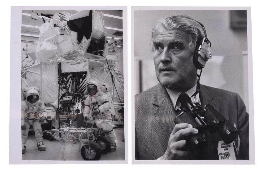 NASAA group of four photographs, comprising:1) Alan Shepard and Edgar Mitchell during lunar surface training with the MET (Modularized Equipment Transporter); close-up of Shepard in spacesuit; the crew at launch complex 39A prior to entering their spacecraft May 1970 - February 1971Three vintage gelatin silver prints on fibre-based paper, each 20.3 x 25.4 cm (8 x 10 in), two NASA numbered 71-H-175, and 70-H-822, one with NASA Kennedy Space Center and one with NASA Headquarters caption on the verso2) Wernher von Braun, the inventor of the Saturn V rocket, monitoring the pre-launch preparations on the day of the launch31 January 1971Vintage gelatin silver print on fibre-based paper, 20.3 x 25.4 cm (8 x 10 in), NASA photo no numbered 71-H-253, with NASA Kennedy Space Center caption on the versoFootnotes:The mission marked Shepard's return to spaceflight after a decade of being grounded due to an inner ear condition.