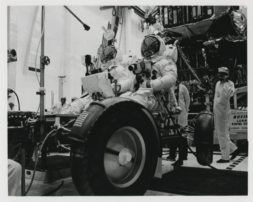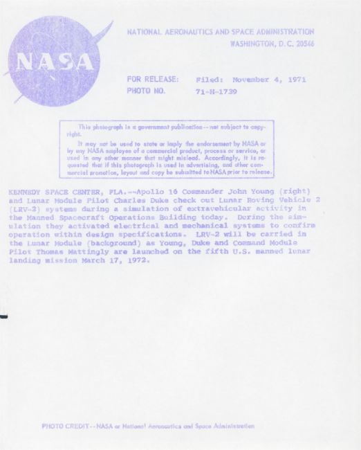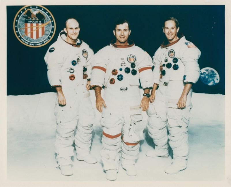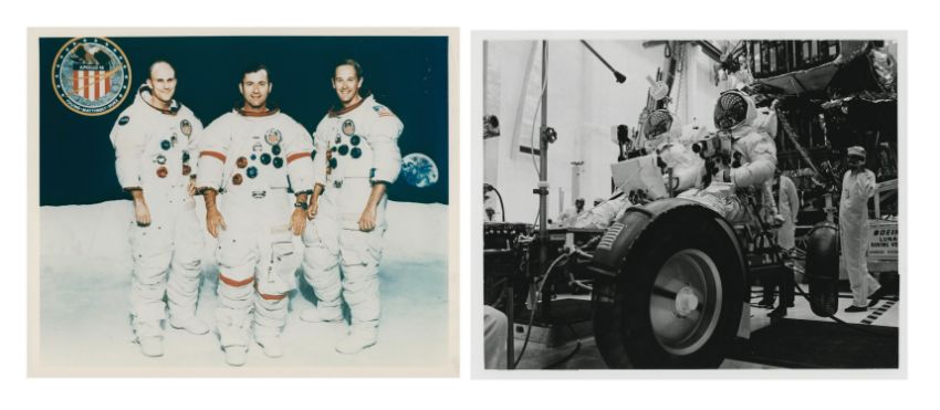 NASAA pair of photographs, comprising:1) Official portrait of the Apollo 16 crew. The crew members John Young, Commander; Ken Mattingly, Command Module pilot; and Charles Duke, Lunar Module pilot pose for a portrait in front of an earthrise image and their mission's insignia (first photograph)January 1972Vintage chromogenic print on fibre-based Kodak paper, 25.4 x 20.3 cm (10 x 8 in), with A KODAK PAPER watermarks on the verso (NASA / RCA)2) John Young (left) and Charles Duke check out the Lunar Rover systems with their camera equipment hung on their chest (second photograph) during a simulation of EVA near the LMNovember 1971Vintage gelatin silver print on fibre-based paper, 25.4 x 20.3 cm (10 x 8 in), NASA photo no 71-H-1739, with NASA Headquarters caption on the versoFootnotes: 'We spent hundreds of hours training in the spacesuits, collecting pseudo-samples, photographing the samples in place and after we had collected them. It taught us how to point the camera and how to center the picture without a viewfinder. The cameras were hung on our chests, and we got to where we could just point the thing and guess the distances. We were pretty good at it; I was pleased with the way they turned out. Charles Duke
