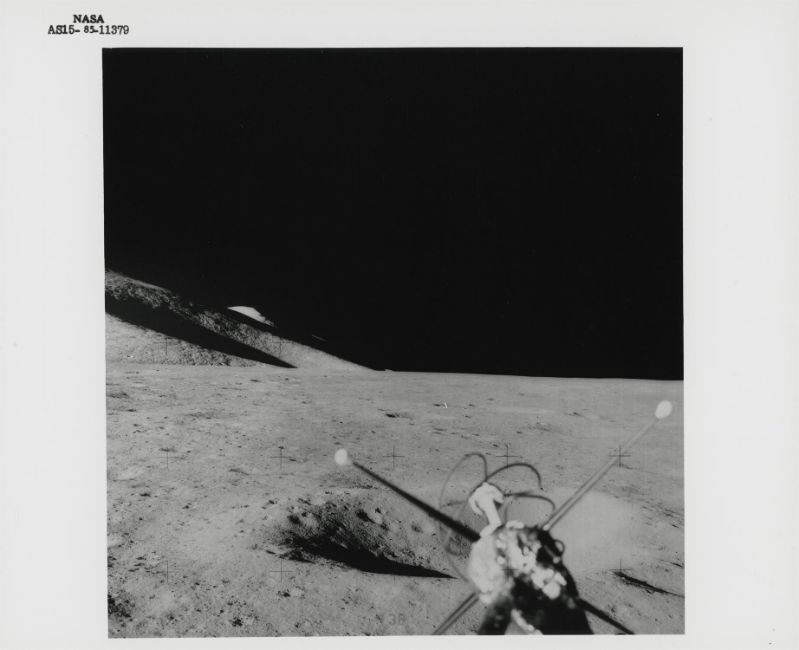 David ScottA pair of Hadley-Apennine landing site views as photographed from the top hatch of the Lunar Module after touchdown, and during the first and the only stand-up EVA from the top hatch of the Lunar Module ever performed on the Moon31 July 1971Two vintage gelatin silver prints on fibre-based paper, each 25.4 x 20.3 cm (10 x 8 in), BLACK NUMBERED NASA AS15-85-11363 and AS15-85-11379 in top margins (NASA Manned Spacecraft Center)Footnotes:Two very rare frames showing two major features of the Hadley-Apennine landing site: the giant Mount Hadley (4,500m) whose summit is barely visible (top right, first photograph) due to the long shadow of the lunar morning and St George Crater on the flank of mount Hadley Delta (second photograph).Following touchdown, Scott and Irwin gave the scientists in Houston a thorough description of the surrounding moonscape and, rather than restricting themselves to the views out the forward-facing windows, they donned helmets and gloves for what was known as a 'Stand-up EVA'. They bled all the air out of the cabin then Scott opened the overhead hatch. Standing on the ascent engine cover with his upper body outside the spacecraft and bracing himself in the opening he took a series of pictures all the way round the horizon with the Hasselblad 70-mm camera.