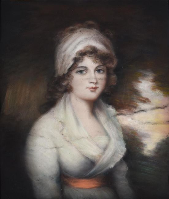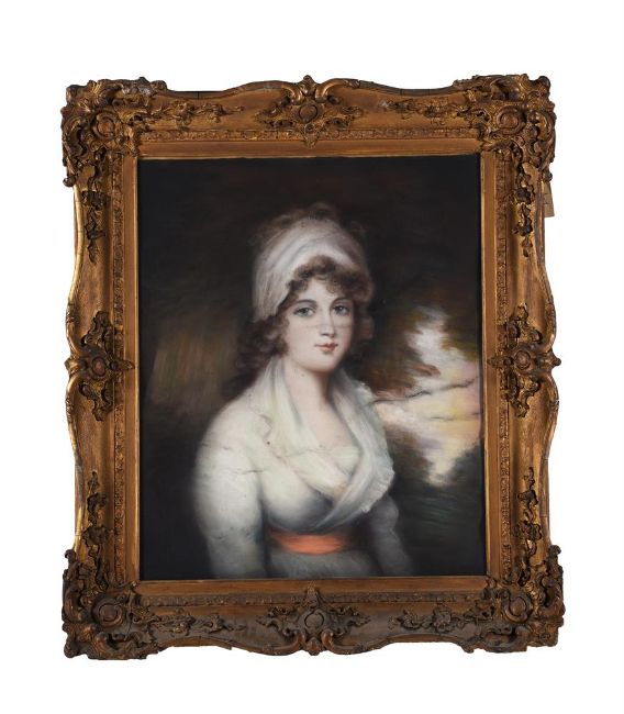After John Hoppner (British 1758-1810)Portrait of a lady, half-length, wearing a white dressPastel74 x 62cm (29 x 24¼ in.)Provenance: Berwick House, ShropshireCondition Report: Under glass, unexamined out of glazed frame. Surface dirt throughout. Slight undulation to the sheet. Speckled black marks, possibly paint splatters, scattered throughout the sheet. Three prominent black horizontal lines across the sheet, one of which across the bridge of the sitter's nose, possibly charcoal marks. Condition Report Disclaimer