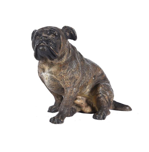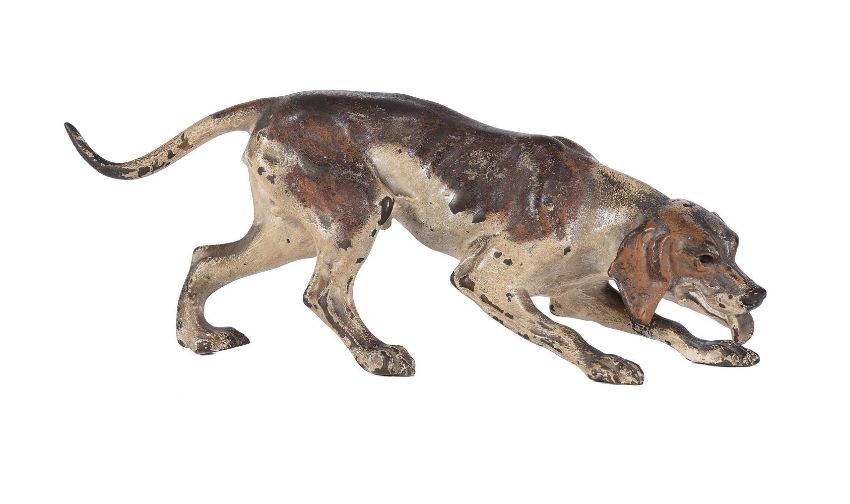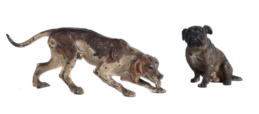 A cold-painted bronze model of a hound, possibly Austrian, circa 1900, 23cm in length; and a cold painted bronze model of a bulldog, 9cm highProvenance: Berwick House, ShropshireCondition Report: The hound, with rubbing to the brown painted areas and chips to the white paintSome marks and scuffs to the leading edges, commensurate with age and wearNo serious loses or damageThe bulldog, with some rubbing to the paint and some knocks, marks and scratches commensurate with age and usePlease refer to additional images for visual reference Condition Report Disclaimer