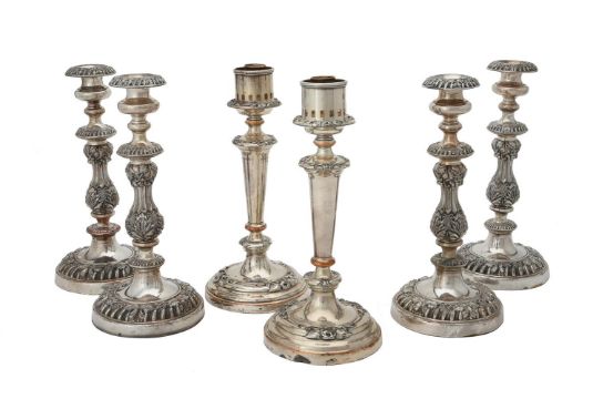 A set of four electro-plated candle sticks, with circular sconces and knopped capitals, chased with gadrooned and grape vine borders, foliate baluster stems and on conforming circular bases, 31cm (12in) high; together with another pair of electro-plated candlesticks, with circular capitals and tapering stems, chased with foliate swags and flowers, on circular moulded spreading bases, 31cm (12in) highProvenance: Berwick House, Shropshire