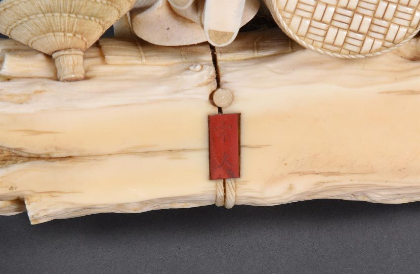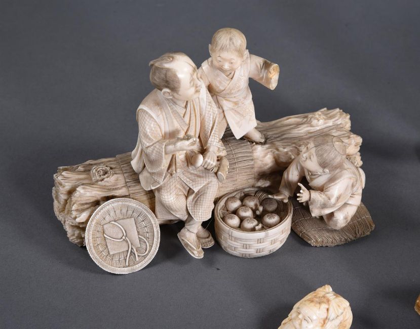 Y A Japanese Ivory Group of a man and boy seated on a large tree trunk, a basket of kumquats beside them, another boy stands on the log, red lacquer signature panel "Munehisa", length 18.5cms, Meiji Period; An Ivory Netsuke of Ebisu catching a large carp; A Chinese Ivory Basket of lobed circular form; Another Japanese Ivory Okimono of a walking peasant; And a Chinese soapstone fishProvenance: Berwick House, ShropshireCondition Report: Various damages and lossesCondition Report Disclaimer