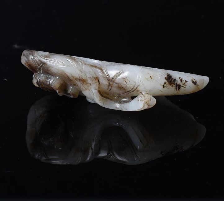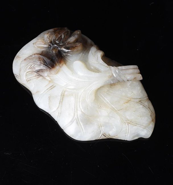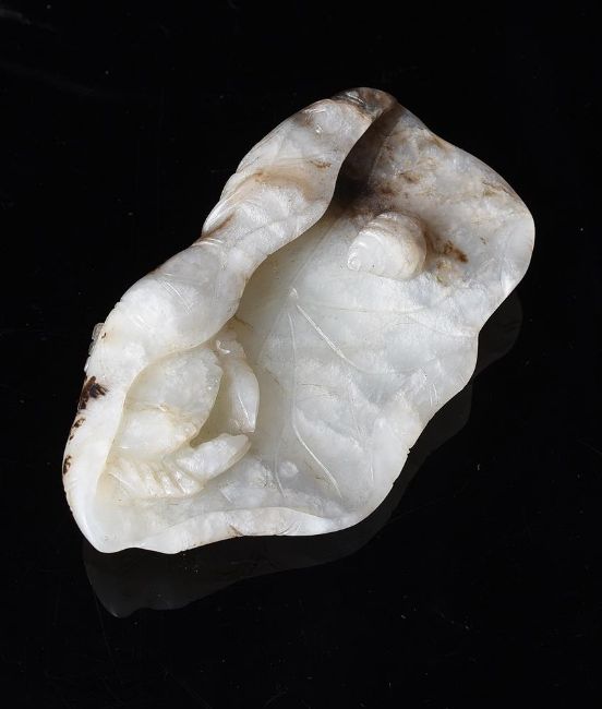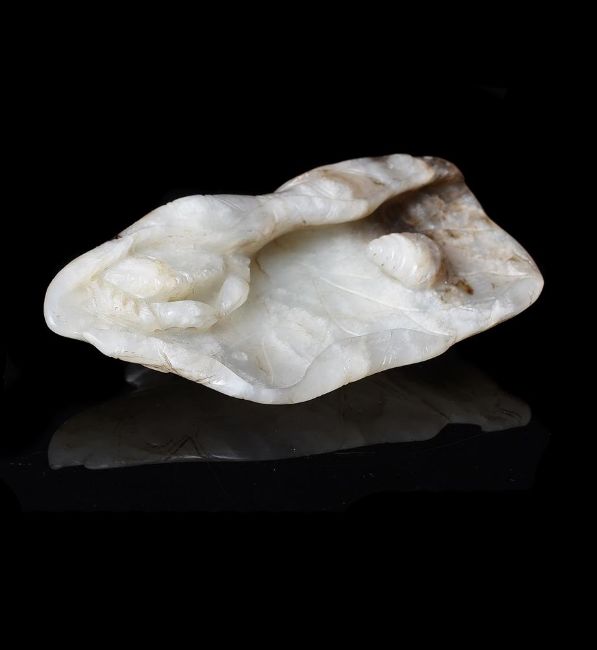 A Chinese white and grey jade 'Lotus' carving, Qing Dynasty, naturalistically worked in the form of a large furled lotus leaf, stem on the underside, the interior further decorated with a crab and a shell, the stone of white tone with grey patches, 7.2cm longProvenance: From the collection of Sir David and Lady Scholey.清 玉雕把莲水虫拍品来源:英国Scholey爵士及女爵伉俪私人收藏,David Scholey爵士为前英格兰国家银行总监及英国国家肖像画廊主席。Condition Report: Minor scratches to the jadeCondition Report Disclaimer