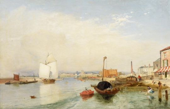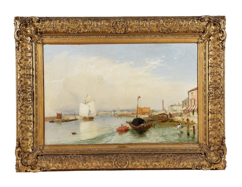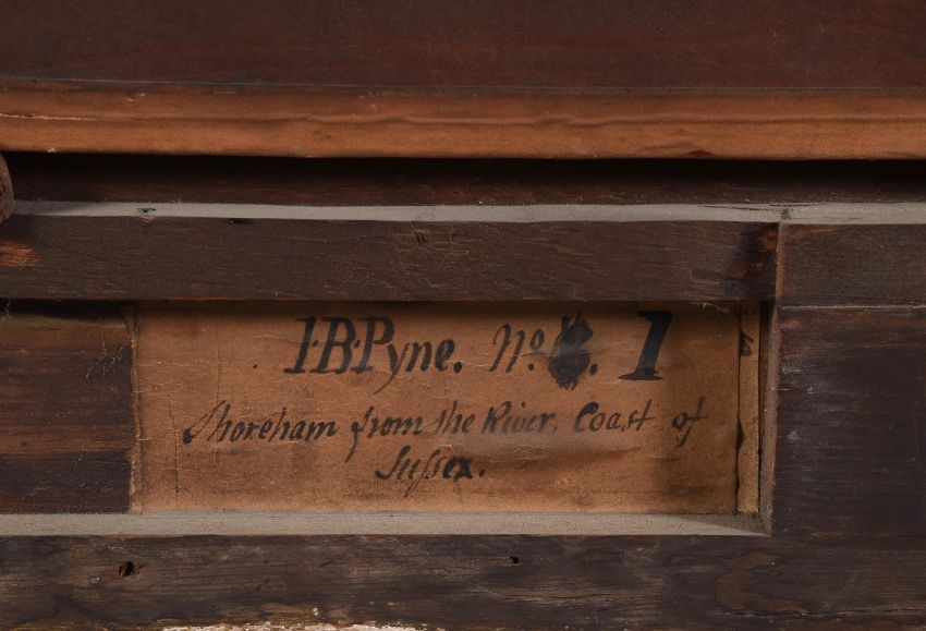 James Baker Pyne (British 1800-1870)A view of Shoreham town's wharfs, SussexOil on canvasSigned and dated 1842 (to mooring post lower right), further signed and titled to artist's label (verso)57 x 88cm (22¼ x 34½ in.)Provenance:Berwick House, Shropshire Condition Report: The canvas has been relined. There are light stretcher marks visible and some light scattered craquelure and a few minor spots of surface dirt. The canvas at the lower right corner is bulging slightly. Ultraviolet light reveals retouching to the lower left hand edge of canvas, as well as scattered retouching to the sky, including a line of possible repair to the upper left quadrant (approx 20cm long). Otherwise in good restored condition, ready to hang.Condition Report Disclaimer