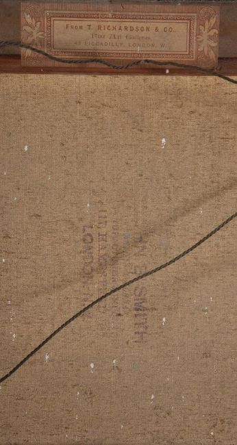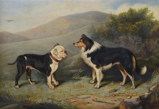 Edward Lloyd (British 1818-1901)A collie and a bulldogOil on canvasSigned and dated Dec 1895 (lower right)32 x 47cm (12½ x 18½ in.)Provenance:Berwick House, Shropshire Condition Report: Appears not to have been relined. Light surface dirt throughout. White blemish below the bulldog's foot. Small circular mark in the upper left quadrant however it is unclear if this was part of the original composition or not. Rubbing and abrasions to the framing edges. Light isolated spots of craquelure to the dark pigment. Inspection under UV reveals very light scattered retouching. Other areas of the work do fluoresce but this appears to be part of the original pigment. Condition Report Disclaimer