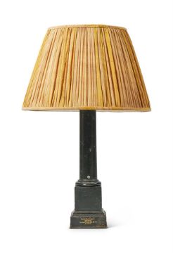 A FRENCH TÔLE PEINTE LAMP BASESECOND HALF 19TH CENTURYOf columnar form, gilt with inscription CARCEL, inventeur BREVETE Rue de l'Arbre-Sec No. 18 A Paris, adapted to electricity, with Robert Kime shade47cm high excluding shadeProvenance: Supplied by Robert KimeCondition Report: Dent to base of column, some paint flaking, some bubbling and deterioration of paint. Condition Report Disclaimer